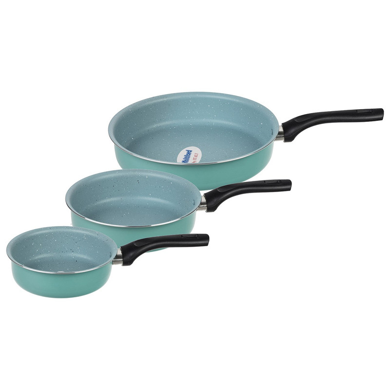 ست تابهی سهپارچهی «تکنو ظرف» مدل «Black 01» شامل سه عدد تابه با پوشش نچسب است که برای پخت غذا با روغن کم، انتخابی ایدئال محسوب میشود. بدنهی این تابهها از جنس آلومینیوم ساخته شده است؛ به همین جهت خیالتان از کیفیت بدنه و دوام آنها آسوده خواهد بود. هر سه تابه ارتفاعی 5 تا 6 سانتیمتری دارند. این تابهها در سایزهای 16، 20 و 26 سانتیمتری تولید شدهاند. دستهی این سه تابه از جنس باکالیت بوده و شرکت تکنو از روکش گرانیت در ساخت این محصول استفاده کرده است. دستهها برای اینکه بهتر در دست قرار بگیرند، کمی خمیده طراحی شدهاند. وجود سه اندازهی مختلف کوچک، متوسط و بزرگ تابه در این مجموعه موجب کاربردیترشدن آن شده است و میتوانید پخت انواع غذاها را در این ست سهپارچه تجربه کرده و اندازهی آن را با توجه به تعداد افراد انتخاب کنید.