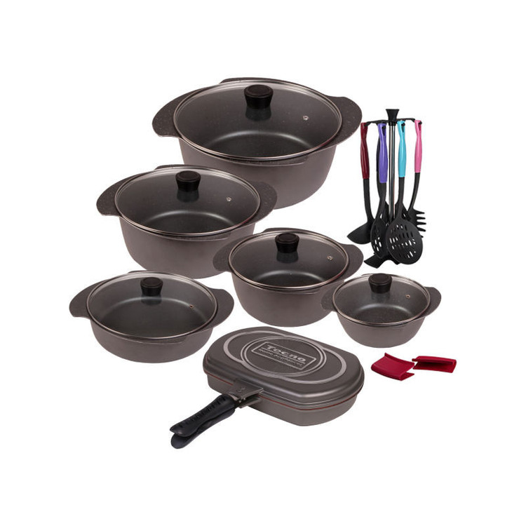 سرویس پخت و پز 21 پارچهی تکنو مدل پروانه شامل چهار قابلمه سایز 20،24،28،32، یک تابه دو دسته سایز 28، یک تابه رژیمی سایز 33، یک جفت دستگیره سیلیکونی و ست کفگیر و ملاقه است. پوشش درونی تابه ها و قابلمه ها از گرانیت نچسب و پوشش بیرونی آن رنگ پودری الکترواستاتیک می باشد. این سرویس بدنهای یکتکه دارد و دستهها بهشکل پروانه، کاملا وصل به بدنه هستند. بدنهی داخلی این سرویس خاکستری رنگ است و تفکیک رنگی آن براساس بدنهی خارجی صورت میگیرد. کفی تمام ظروف ضخیم است و انتقال حرارت بهصورت کاملا یکنواخت انجام میشود؛ درنتیجه مواد غذایی یکدست پخته میشوند. درپوشهای این ست از شیشه هستند و با رینگ استیل پوشیده شدهاند و برای خروج بخار از ظروف یک سوپاپ ریز روی آنها تعبیه شده است. در کنار این ظروف یک ست ابزار آشپزی 6 پارچه بههمراه استند دارید که برای این ظروف نچسب باید از آن استفاده کرد. یک جفت دستگیرهی سیلیکونی نیز در این سرویس دارید که برای جابهجایی ظروف قابلاستفاده است. برای اینکه سطح داخلی ظروف شما برای مدتهای طولانی سالم و بدون خش بماند، تلاش کنید که همیشه از ابزارهای آشپزی مناسب برای این ظروف استفاده کنید.