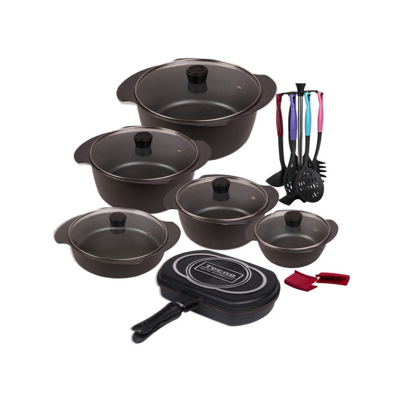 سرویس پخت و پز 21 پارچهی تکنو مدل پروانه شامل چهار قابلمه سایز 20،24،28،32، یک تابه دو دسته سایز 28، یک تابه رژیمی سایز 33، یک جفت دستگیره سیلیکونی و ست کفگیر و ملاقه است. پوشش درونی تابه ها و قابلمه ها از گرانیت نچسب و پوشش بیرونی آن رنگ پودری الکترواستاتیک می باشد. این سرویس بدنهای یکتکه دارد و دستهها بهشکل پروانه، کاملا وصل به بدنه هستند. بدنهی داخلی این سرویس خاکستری رنگ است و تفکیک رنگی آن براساس بدنهی خارجی صورت میگیرد. کفی تمام ظروف ضخیم است و انتقال حرارت بهصورت کاملا یکنواخت انجام میشود؛ درنتیجه مواد غذایی یکدست پخته میشوند. درپوشهای این ست از شیشه هستند و با رینگ استیل پوشیده شدهاند و برای خروج بخار از ظروف یک سوپاپ ریز روی آنها تعبیه شده است. در کنار این ظروف یک ست ابزار آشپزی 6 پارچه بههمراه استند دارید که برای این ظروف نچسب باید از آن استفاده کرد. یک جفت دستگیرهی سیلیکونی نیز در این سرویس دارید که برای جابهجایی ظروف قابلاستفاده است. برای اینکه سطح داخلی ظروف شما برای مدتهای طولانی سالم و بدون خش بماند، تلاش کنید که همیشه از ابزارهای آشپزی مناسب برای این ظروف استفاده کنید.