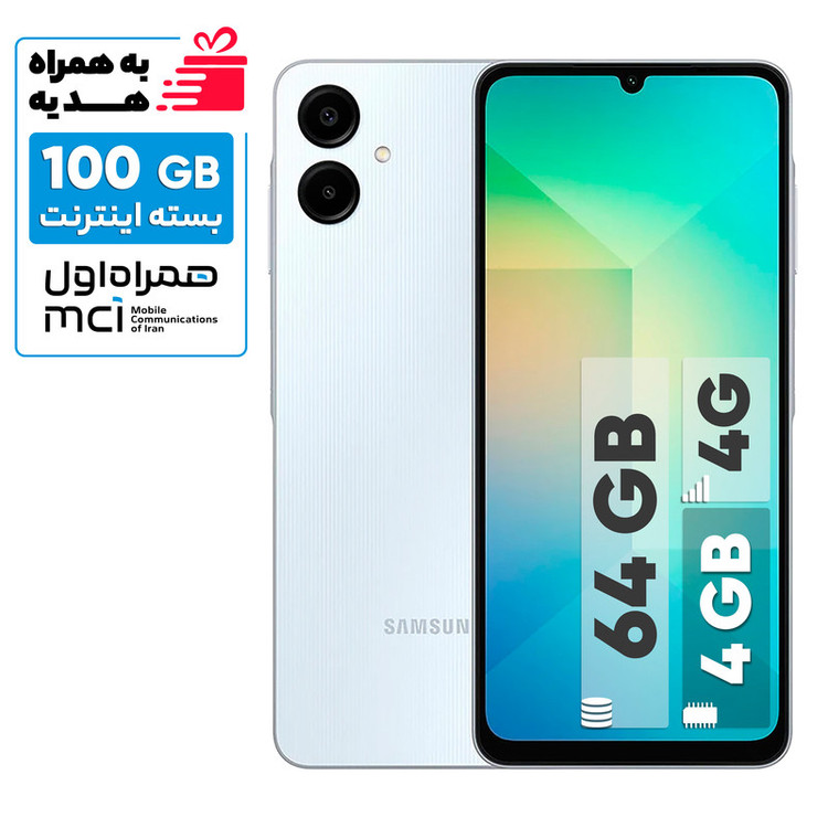 گوشی موبایل سامسونگ مدل Galaxy A06 دو سیم کارت ظرفیت 64 گیگابایت و رم 4 گیگابایت - به همراه بسته اینترنت 100 گیگابایتی یک ماهه همراه اول