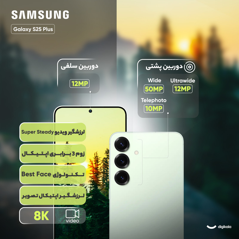 سامسونگ گلکسی S25 پلاس یکی از برجستهترین و پیشرفتهترین پرچمداران این برند است که در سال 2025 معرفی شد. این گوشی با طراحی زیبا و بدنهای مقاوم از جنس شیشه و فریم آلومینیومی، علاوه بر جذابیت ظاهری، استاندارد IP68 را برای مقاومت در برابر آب و گرد و غبار به ارمغان میآورد. ضخامت دستگاه تنها 7.3 میلیمتر و وزن آن 190 گرم است که احساس راحتی و سبکی در دست را به کاربر منتقل میکند.