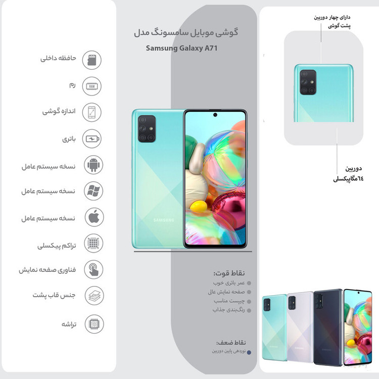 گوشی موبایل گلکسی A71 سامسونگ یکی از قدرتمندترین محصولات میانرده موجود در بازار است که حسگر انگشت زیرصفحه نمایش و دوربین چهارگانه روانه بازار شده است. سامسونگ سال 2019 را با متنوع کردن هرچند بیشتر سری گوشیهای A خود آغاز کرد. این سری از تولیدات سامسونگ به داشتن صفحهنمایش بسیار با کیفیت AMOLED و دوربینهایی با امکانات بالا شهرت دارند. گوشی موبایل Galaxy A71 با صفحهنمایش سوپر آمولد طراحی شده است و ظاهر هم زیبایی دارد. سامسونگ تلاش کرده است حاشیه را در این تولید جدید خود تا حد امکان کم کند. این گوشی قاب پشتی از جنس پلاستیک دارد و قاب جلویی آن را شیشه پوشانده که البته جلوهی زیبایی به گوشی داده است. این محصول سامسونگ با جدیدترین نسخه از سیستمعامل اندروید روانه بازار شده است تا از هر نظر گوشی مدرن بهحساب بیاید. صفحهنمایش استفادهشده در این گوشی 6.7 اینچ با رزولوشن FullHD+ است که با استفاده از فناوری Super AMOLED و پنل OLED تصاویر شفاف و بینظیری را به نمایش میگذارد. این صفحهنمایش در هر اینچ 393 پیکسل را نشان میدهد که این یعنی جزئیات و وضوح تصویر عالی است. همچنین روکش این نمایشگر لایهی محافظ Corning Gorilla Glass 3 است که از خطوخش و ضربه جلوگیری میکند. تراشهی این محصول،Qualcomm SDM730 Snapdragon 730 از تراشههای 8 نانومتری کوالکام است که به همراه 8 گیگابایت رم عرضه میشود. این تراشه برای بازکردن چندین برنامه به صورت همزمان و تماشای ویدئو کاملاً مناسب است. تراشهی گرافیکی Adreno 618 هم برای پخش ویدئو و بازی در این محصول درنظر گرفته شده است. این گوشی در ظرفیت 128 گیگابایتی عرضه شده است و با استفاده از یک کارت حافظهی جانبی قادر خواهید بود حافظه داخلی را تا یک ترابایت دیگر هم افزایش دهید. دوربین اصلی A71 سنسور 64 مگاپیکسلی دارد و فلش LED برخوردار است. سنسور 12 مگاپیکسلی دیگر از نوع فوق عریض (Ultrawide) و سنسور 5 مگاپیکسلی عمق و لنز ماکرو هم در کنار این دوربین اصلی مجموعه دوربینهای قاب پشتی A71 را تشکیل دادهاند. دوربین سلفی 32مگاپیکسلی هم در قاب جلویی این گوشی به کار گرفته شده است. باتری 4500 میلیآمپرساعتی، پشتیبانی از فناوری شارژ سریع 25 واتی، درگاه USB Type-C و حسگر اثرانگشت اپتیکال در زیر صفحهنمایش هم از دیگر ویژگیهای این تازهوارد است.