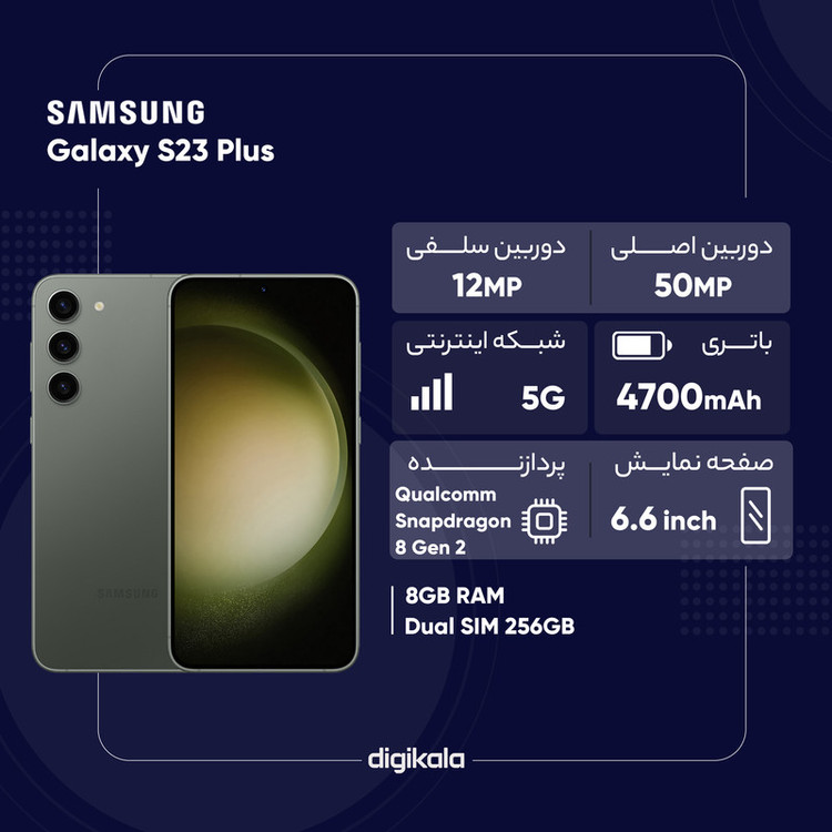 سامسونگ Galaxy S23 Plus یکی از اعضای خانواده S23 است که در مقایسه با مدل استاندارد یعنی Galaxy S23 به صفحهنمایشی با ابعاد بزرگتر و البته باتری قدرتمندتری مجهز شده است. در همان نگاه اول، طراحی متفاوت و البته زیباتر در نظر گرفته شده برای این گوشی هوشمند به نسبت نسل قبلی یعنی Galaxy S22 Plus، توجه شما را به خودش جلب میکند. صفحهنمایش 6.6 اینچ با رزولوشن 1080×2340 پیکسل از نوع Dynamic AMOLED 2X با توانایی نمایش 390 یکسل در هر اینچ، نرخ بروزرسانی 120 هرتز و حداکثر روشنایی 1750 نیت (nits) سبب شدهاند تا با صفحهنمایش بسیار باکیفیت و زیبایی روبهرو باشید. سنسورهای دوربین این گوشی تفاوتی با مدل استاندارد ندارد. سنسور دوربین عریض 50 مگاپیکسل در کنار سنسور 10 مگاپیکسل از نوع تلهفوتو با قابلیت زوم 3 برابری اپتیکال و سنسور 12 مگاپیکسل فوق عریض (ultrawide)، سنسورهای دوربین سهگانه گوشی موبایل سامسونگ مدل Galaxy S23 Plus دو سیم کارت ظرفیت 256 گیگابایت و رم 8 گیگابایت را تشکیل میدهند. بهره بردن از چنین سنسورهایی در کنار توانایی ضبط ویدیو 8K و نهایت سرعت 30 فریم در ثانیه، سبب شدهاند تا در عکاسی و فیلمبرداری این گوشی عملکرد درخشانی داشته باشد. دوربین سلفی 12 مگاپیکسل این گوشی هم توانایی ضبط ویدیو 4K با نهایت سرعت 60 فریم در ثانیه را دارد. سیستم عامل پایه Android 13 برای گوشی گلكسی در نظر گرفته شده است. تمامی اعضای خانواده S23 از پردازندهای مشابه بهره بردهاند. پردازنده اسنپدراگون 8 نسل دو شرکت کوالکام این گوشی را همراهی میکند و باید خیالتان راحت باشد که از پس اجرای سنگینترین بازیهای روز دنیا برمیآید. باتری با میزان ظرفیت 4700 میلیآمپرساعت و پشتیبانی از فناوری شارژ سریع با توان 45 وات از دیگر مشخصات در نظر گرفته شده برای این گوشی هوشمند است. در مجموع باید بگوییم که اگر قصد خرید یکی از پرچمداران سری S23 را دارید و میخواهید هزینه کمتری به نسبت مدل اولترا را در نظر بگیرید و به صفحهنمایشی به نسبت بزرگ و باتری مناسبتر به نسبت مدل استاندارد نیاز دارید، بدون شک سامسونگ Galaxy S23 Plus میتواند یکی از بهترین انتخابهای ممکن برای شما باشد.