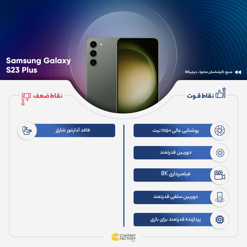 سامسونگ Galaxy S23 Plus یکی از اعضای خانواده S23 است که در مقایسه با مدل استاندارد یعنی Galaxy S23 به صفحهنمایشی با ابعاد بزرگتر و البته باتری قدرتمندتری مجهز شده است. در همان نگاه اول، طراحی متفاوت و البته زیباتر در نظر گرفته شده برای این گوشی هوشمند به نسبت نسل قبلی یعنی Galaxy S22 Plus، توجه شما را به خودش جلب میکند. صفحهنمایش 6.6 اینچ با رزولوشن 1080×2340 پیکسل از نوع Dynamic AMOLED 2X با توانایی نمایش 390 یکسل در هر اینچ، نرخ بروزرسانی 120 هرتز و حداکثر روشنایی 1750 نیت (nits) سبب شدهاند تا با صفحهنمایش بسیار باکیفیت و زیبایی روبهرو باشید. سنسورهای دوربین این گوشی تفاوتی با مدل استاندارد ندارد. سنسور دوربین عریض 50 مگاپیکسل در کنار سنسور 10 مگاپیکسل از نوع تلهفوتو با قابلیت زوم 3 برابری اپتیکال و سنسور 12 مگاپیکسل فوق عریض (ultrawide)، سنسورهای دوربین سهگانه گوشی موبایل سامسونگ مدل Galaxy S23 Plus دو سیم کارت ظرفیت 256 گیگابایت و رم 8 گیگابایت را تشکیل میدهند. بهره بردن از چنین سنسورهایی در کنار توانایی ضبط ویدیو 8K و نهایت سرعت 30 فریم در ثانیه، سبب شدهاند تا در عکاسی و فیلمبرداری این گوشی عملکرد درخشانی داشته باشد. دوربین سلفی 12 مگاپیکسل این گوشی هم توانایی ضبط ویدیو 4K با نهایت سرعت 60 فریم در ثانیه را دارد. سیستم عامل پایه Android 13 برای گوشی گلكسی در نظر گرفته شده است. تمامی اعضای خانواده S23 از پردازندهای مشابه بهره بردهاند. پردازنده اسنپدراگون 8 نسل دو شرکت کوالکام این گوشی را همراهی میکند و باید خیالتان راحت باشد که از پس اجرای سنگینترین بازیهای روز دنیا برمیآید. باتری با میزان ظرفیت 4700 میلیآمپرساعت و پشتیبانی از فناوری شارژ سریع با توان 45 وات از دیگر مشخصات در نظر گرفته شده برای این گوشی هوشمند است. در مجموع باید بگوییم که اگر قصد خرید یکی از پرچمداران سری S23 را دارید و میخواهید هزینه کمتری به نسبت مدل اولترا را در نظر بگیرید و به صفحهنمایشی به نسبت بزرگ و باتری مناسبتر به نسبت مدل استاندارد نیاز دارید، بدون شک سامسونگ Galaxy S23 Plus میتواند یکی از بهترین انتخابهای ممکن برای شما باشد.