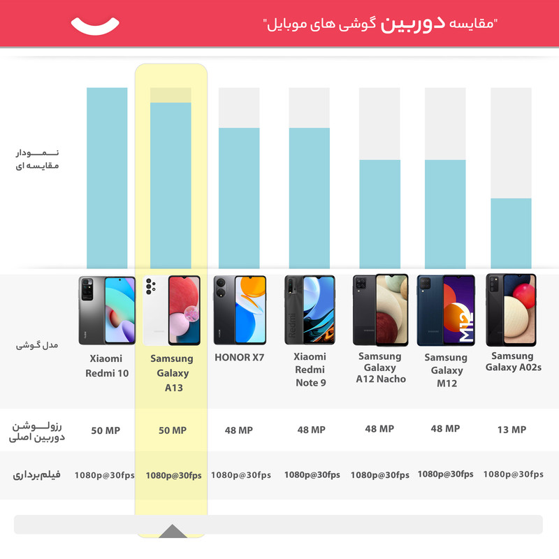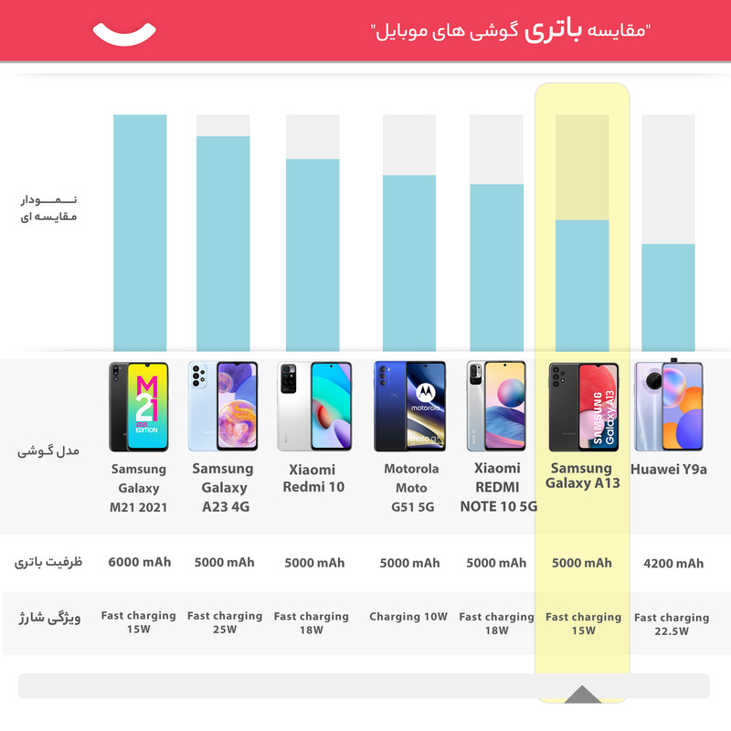 سامسونگ Galaxy A13 یکی از گوشیهای هوشمند میانرده جدید سامسونگ است که به نسبت پارتنامبر قبلی خود، در برخی از مشخصات فنی تفاوتهایی با یکدیگر دارند. در نمای روبهرویی این گوشی به صفحهنمایش با ابعاد 6.6 اینچ و رزولوشن 1080×2408 پیکسل از نوع PLS مجهز شده که توانایی نمایش 400 پیکسل در هر اینچ را دارد. طراحی ناچ واتردراپ یا همان اینفینیتی U برای این صفحهنمایش در نظر گرفته شده است که بریدگی قطرهای شکل ناچ در قسمت بالایی و مرکزی صفحهنمایش، سنسور دوربین سلفی با رزولوشن 8 مگاپیکسل را در خود جای داده است. در قسمت پشتی هم یک سنسور دوربین اصلی قدرتمند با رزولوشن 50 مگاپیکسل از نوع عریض (wide) در کنار سنسور 5 مگاپیکسل فوق عریض (ultrawide) و دو سنسور با رزولوشن 2 مگاپیکسل از نوع ماکرو و سنجش عمق، سنسورهای دوربین چهارگانه سامسونگ Galaxy A13 را تشکیل میدهند. اما اصلیترین تفاوت این گوشی با پارتنامبر دیگر، در مشخصات سختافزاری و پردازنده در نظر گرفته شده است. این گوشی به پردازنده هلیو G80 شرکت مدیاتک مجهز شده است که توانایی ارائه عملکرد قابل قبولی را در اجرای بازیها و نرمافزارهای محبوب و کاربردی دارد. در انتها هم، همانند اکثر گوشیهای هوشمند سری A سامسونگ، این گوشی هم از باتری مناسب و قدرتمندی بهره برده است. باتری با میزان ظرفیت 5000 میلیآمپرساعت که به ازای هر بار شارژ صد درصدی، توانایی ارائه طول عمر مفید دو روز را به ازای هر بار شارژ صد درصدی دارد.