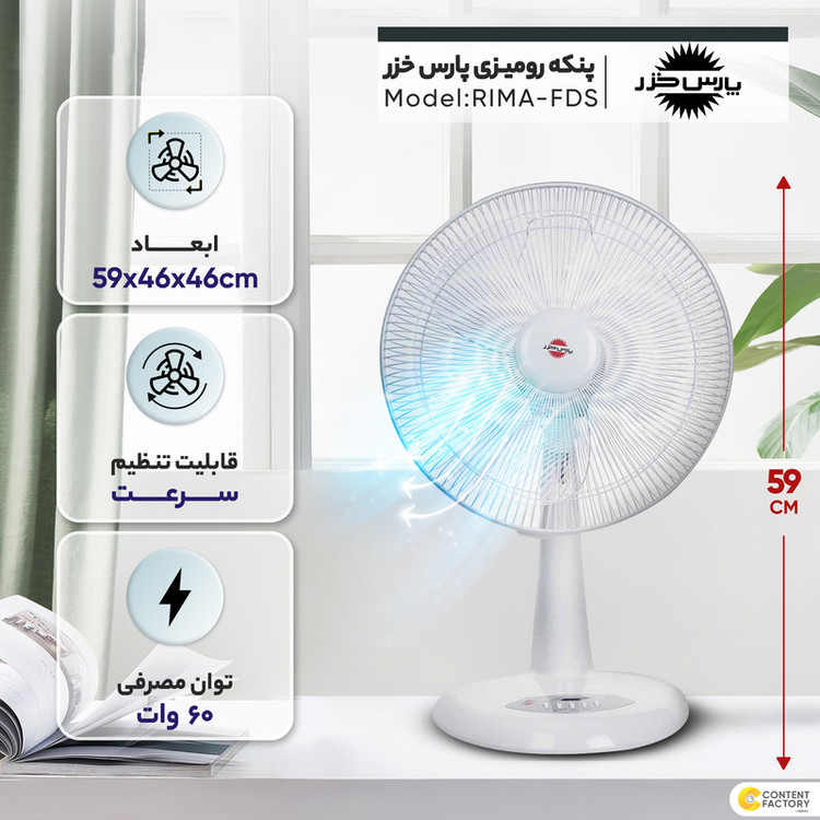 پنکه «پارسخزر» مدل «RIMA-FDS» از پنکههای طرح رومیزی است که توسط اینشرکت تولید و بهبازار عرضه شده است. پنکهها همچنان از دستگاههای سرمایشی محبوب هستند که در خانه و ادارات کاربرد فراوانی دارند. از مزایای پنکهها نسبتبه دیگر دستگاههای سرمایشی میتوان به امکان جابجایی آسان، قابلیت تنظیم زاویه وزش باد، و همچنین وزش باد با گردش افقی اشاره کرد. این مدل دارای چهار پره است که بین دو صفحه محافظ مشبک قرار گرفته است. کاربر ازطریق کلیدهای تعبیهشده روی پایه، قادر به خاموش و روشن کردن و تغییر تنظیمات دستگاه است. کلیدهای تنظیم سرعت در سه حالت است و نشانگر LED نیز دارد. قابلیت تنظیم گردش افقی نیز از دیگر مشخصاتی است که میتواند به کارایی این دستگاه برای خنککردن محیط موردنظر اضافه کند. این دستگاه بهراحتی بهمحل موردنظر جابهجا میشود. طراحی کلاسیک پنکه رومیزی پارسخزر RIMA-FDS به رنگ سفید، و پایه زیبای این مدل آنرا به انتخابی قابلتأمل برای مصرفکنندگان مختلف تبدیل میسازد. از دیگر قابلیتهای این دستگاه میتوان به موتور مجهز به فیوز حرارتی آن اشاره کرد که نگرانیهای حاصلاز فعالیت طولانیمدت این دستگاه را مرتفع میسازد. لازمبهذکر است پنکه رومیزی پارسخزر RIMA-FDS از گواهینامه استاندارد ایمنی محصول و همچنین نشان استاندارد اروپایی CE نیز بهره میبرد. توان مصرفی این پنکه 60 وات است.