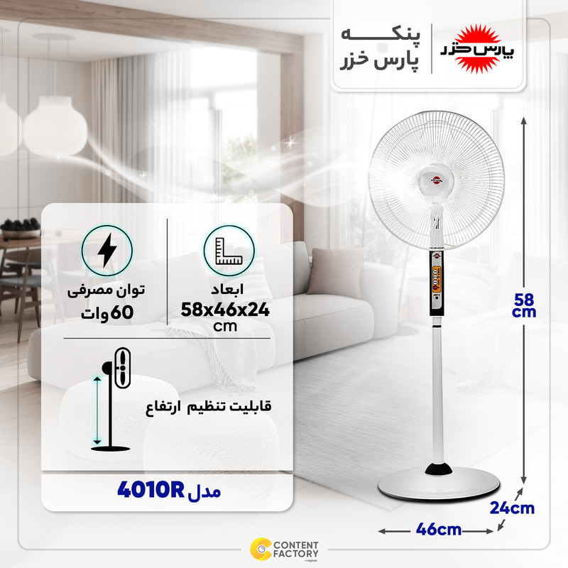پنکه «پارس خزر» مدل «4010R» یکی از محصولات شرکت پارسخزر است که از دسته پنکههای ایستاده پایهدار محسوب میشود و با طراحی زیبا و همچنین یک ریموت کنترل تولید و عرضه شده است.این پنکه از پایه با قابلیت تنظیم ارتفاع بهره میبرد و میتوانید با توجه به نیاز خود آن را در بهترین حالت تنظیم کنید. یکی از امکانات قابلتوجه این مدل امکان وزش ریتمیک است که وزش بادی ملایم را شبیهسازی کند. این پنکه از چهار پره بهره میبرد که بین دو صفحه محافظ مشبک قرار گرفته است. تایمر پنکه پارس خزر 4010R هم از دیگر قابلیتهای کاربردی آن است که میتواند در مواقع مختلف کاربردی و مفید واقع گردد. سرعت عملکرد این مدل قابل تنظیم است تا با توجه به شرایط محیط سرعت آن را کاهش و یا افزایش دهید. بر روی پایه این مدل کلیدهای کنترلی بهصورت لمسی تعبیهشده که به کمک آن، علاوه بر خاموش و روشن کردن دستگاه میتوان به فعال یا غیرفعالسازی حالت ریتمیک، تغییر سرعت و همچنین تنظیم تایمر پرداخت. لازم به ذکر است از طریق ریموت کنترل دستگاه از راه دور نیز میتوان به اعمال این تنظیمات پرداخت و به راحتی از طریق نشانگرهای روی پایه از تنظیمات فعلی دستگاه مطلع شد. درمجموع طراحی ساده و مستحکم این مدل، موتور مجهز به فیوز حرارتی، و همچنین بهرهمندی از گواهینامه استاندارد ایمنی و نشان استاندارد اروپایی CE از دیگر مواردی است که نشان از کیفیت و ایمنی این دستگاه دارد و میتوان آن را گزینهای مطلوب برای استفاده در اماکن مختلف در نظر داشت.