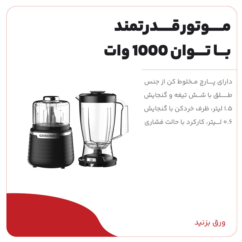 سایر توضیحاتخردکن 1 2 3 بهمراه مخلوط کن گوسونیک، موتور پرقدرت با توان 1000 وات، دارای پارچ مخلوط کن از جنس طلق با شش تیغه و گنجایش 1.5 لیتر، ظرف خردکن با گنجایش 0.6 لیتر، کارکرد با حالت فشاری (1 2 3)، مخزن خردکن جداشو و قابل شستشو