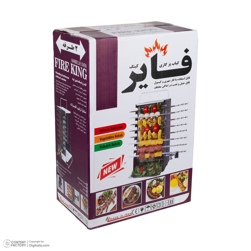از زمان قدیم کباب یکی ازغذاهای لذیذ و محبوب ایرانی ها به شمار می رود. در قدیم برای پخت کباب از آتش استفاده می شده است، اما مشکلاتی مانند آلودگی و سرعت پایین را به همراه داشت. همین دلایل نیاز به دستگاهی را بوجود آورد که بتواند همه این مشکلات را حل کند. کباب پزایستاده فایر مدل KING به گونه ای طراحی شده است که بدون دود و یا سوزاندن لایه رویی کباب باعث پخت لایه ای آن می شود. این دستگاه دارای جای 14 عدد سیخ کباب می باشد که میتواند هم با گاز شهری و هم با گاز کپسول کار می کند. این دستگاه کم جا می گیرد و با وزن سبکی که دارد حمل آن را آسان می کند. این دستگاه قابلیت پخت انواع کباب کوبیده، کباب برگ، چنجه، کباب سلطانی، کباب بختیاری، جگر و جوجه کباب را دارد. با خرید این کباب پز به راحتی میتوانید در آپارتمان خود کباب بپزید زیرا این کباب پز بدون ایجاد دود می باشد. تابش حرارت یکنواخت از بالا باعث مغز پخت کامل کباب می شود . همچنین کباب پز فایر مدل KING دارای پایه تاشو می باشد.