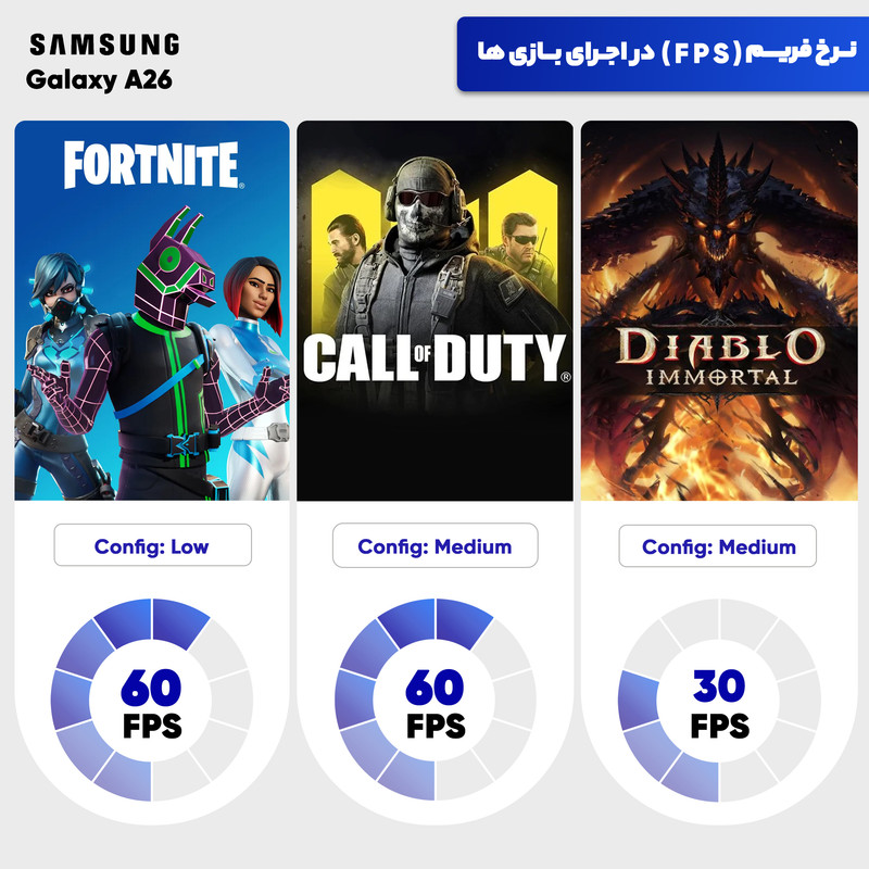 نمایشگر ۶.۷ اینچی Super AMOLED با رزولوشن FHD+ و نرخ نوسازی ۱۲۰ هرتزی، تجربهای لذتبخش و چشمنواز را در هنگام تماشای ویدیو و کارهای روزمره برای شما فراهم میکند. در بخش پردازنده،Galaxy A26 به چیپست Exynos 1380 مجهز شده است که برای اجرای نرمافزارها، شبکههای اجتماعی و حتی برخی بازیها عملکرد مناسبی دارد.