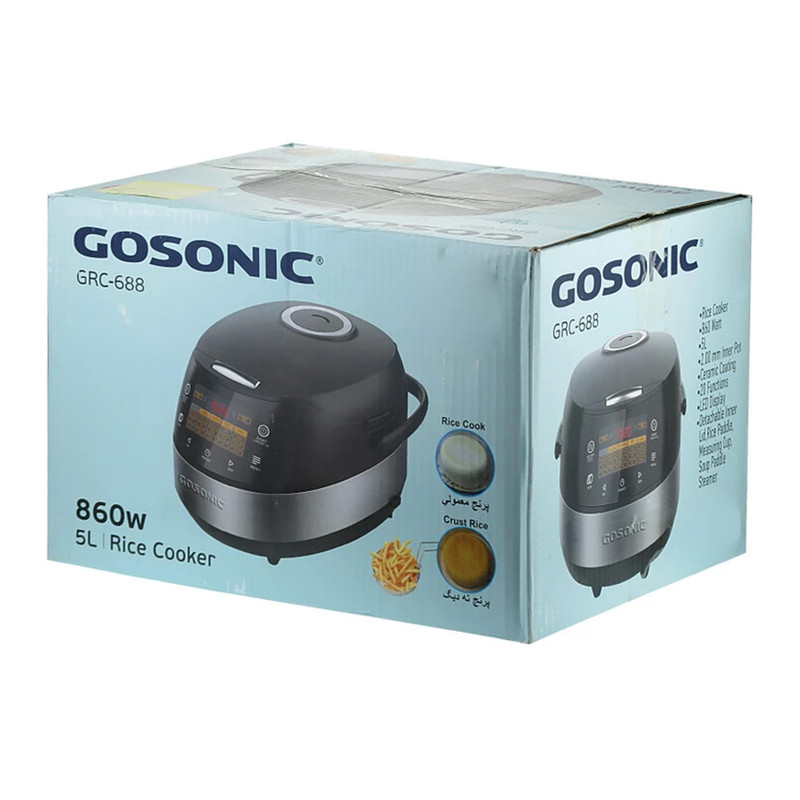 برای ایمنی بیشتر، دستگاه به سیستم خاموشی خودکار مجهز شده است. دفترچه راهنما نیز بهعنوان اقلام همراه، کار با دستگاه و تنظیم برنامهها را سادهتر میکند. وجود صفحه نمایش و طراحی کاربرپسند، استفاده از پلوپز گوسونیک GRC-688 را به تجربهای راحت و لذتبخش تبدیل میکند.