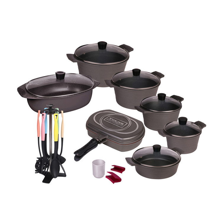 سرویس پخت و پز 24 پارچه تکنو مدل ونوس شامل چهار عدد قابلمه سایز 20، 24، 28 و 32 و یک عدد تابه سایز 28 و یک تابه رژیمی سایز 33، یک رستر به همراه ست کفگیر ملاقه، یک جفت دستگیره سیلیکونی و یک پیمانه مدرج است. پوشش درونی تابه ها و قابلمه ها از گرانیت نچسب و پوشش بیرونی آن ها رنگ پودری الکترواستاتیک می باشد. بدنهی داخلی این سرویس خاکستری رنگ است و تفکیک رنگی آن براساس بدنهی خارجی صورت میگیرد. کفی تمام ظروف ضخیم است و انتقال حرارت بهصورت کاملا یکنواخت انجام میشود؛ درنتیجه مواد غذایی یکدست پخته میشوند.