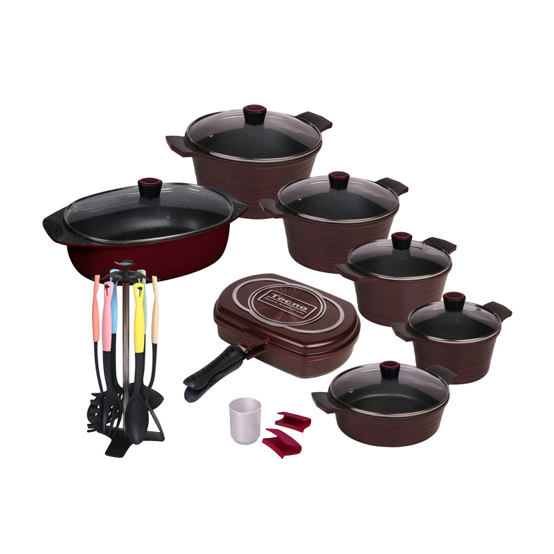 درپوشهای این ست از شیشه هستند و با رینگ استیل پوشیده شدهاند و برای خروج بخار از ظروف یک سوپاپ ریز روی آنها تعبیه شده است. در کنار این ظروف یک ست ابزار آشپزی 6 پارچه بههمراه استند دارید که برای این ظروف نچسب باید از آن استفاده کرد. یک جفت دستگیرهی سیلیکونی نیز در این سرویس دارید که برای جابهجایی ظروف قابلاستفاده است. برای اینکه سطح داخلی ظروف شما برای مدتهای طولانی سالم و بدون خش بماند، تلاش کنید که همیشه از ابزارهای آشپزی مناسب برای این ظروف استفاده کنید.